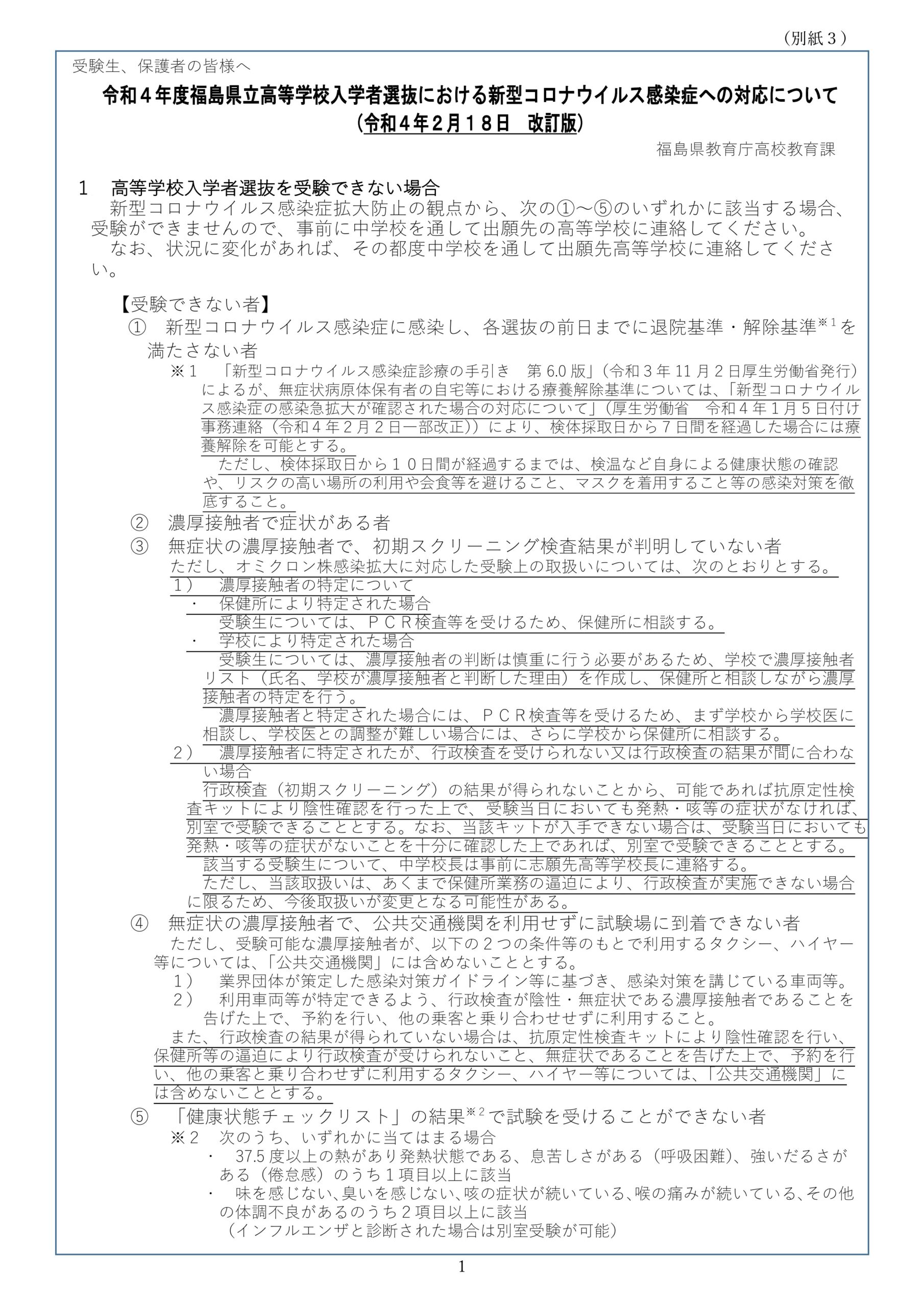 2022年2月28日 【終了】令和4年度福島県立高等学校入学者選抜関連情報について 新型コロナウイルス感染症への対応について(改訂版)の掲載がありましたので、お知らせいたします。 詳しくは福島県教育委員会…