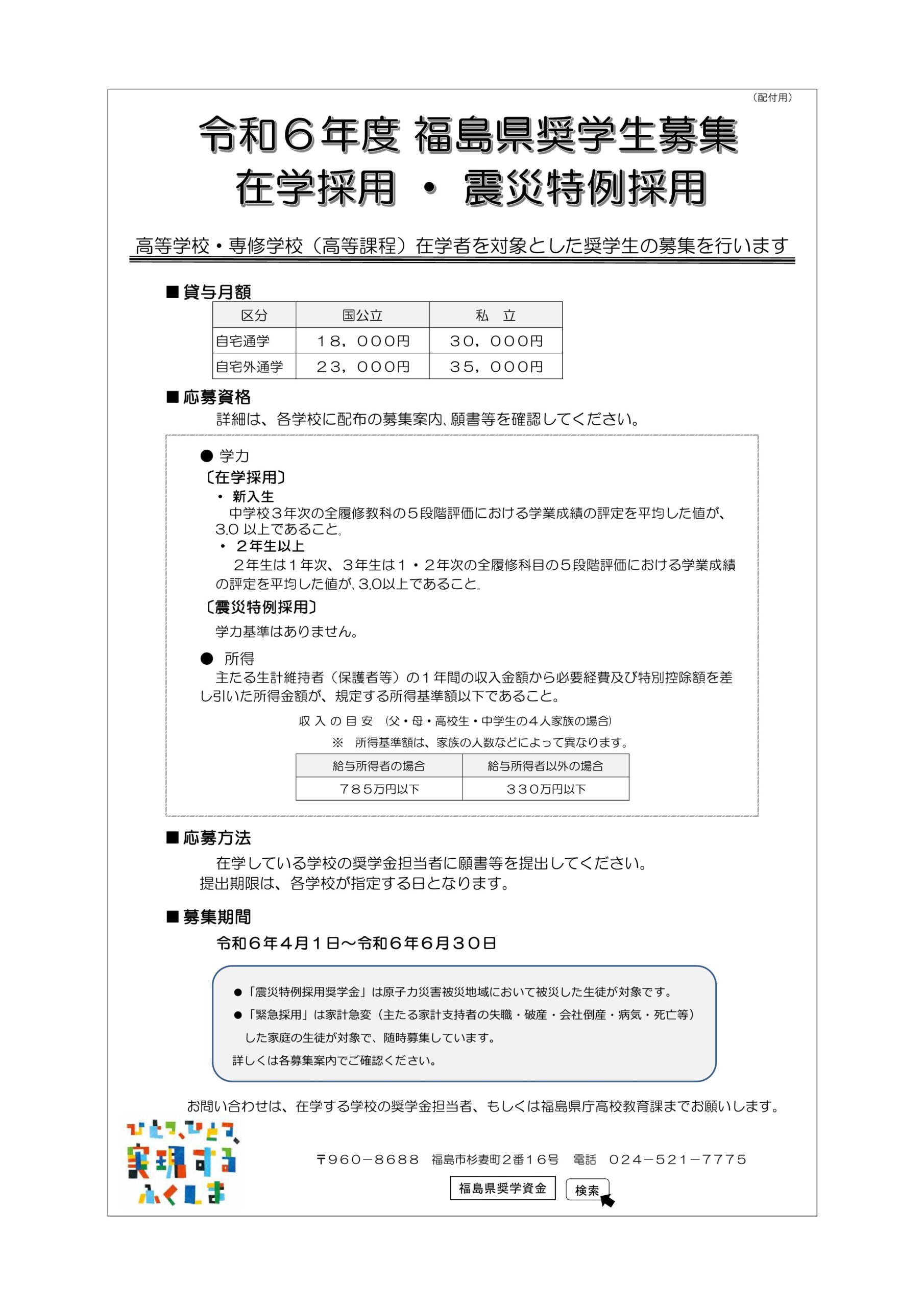 2024年3月18日 福島県からのお知らせ 令和6年度 福島県奨学資金《震災特例採用》募集のご案内 福島県教育委員会では、原子力災害被害地域において被災し、経済的理由により修学が困難となった高校生を支援するため、福島県奨…